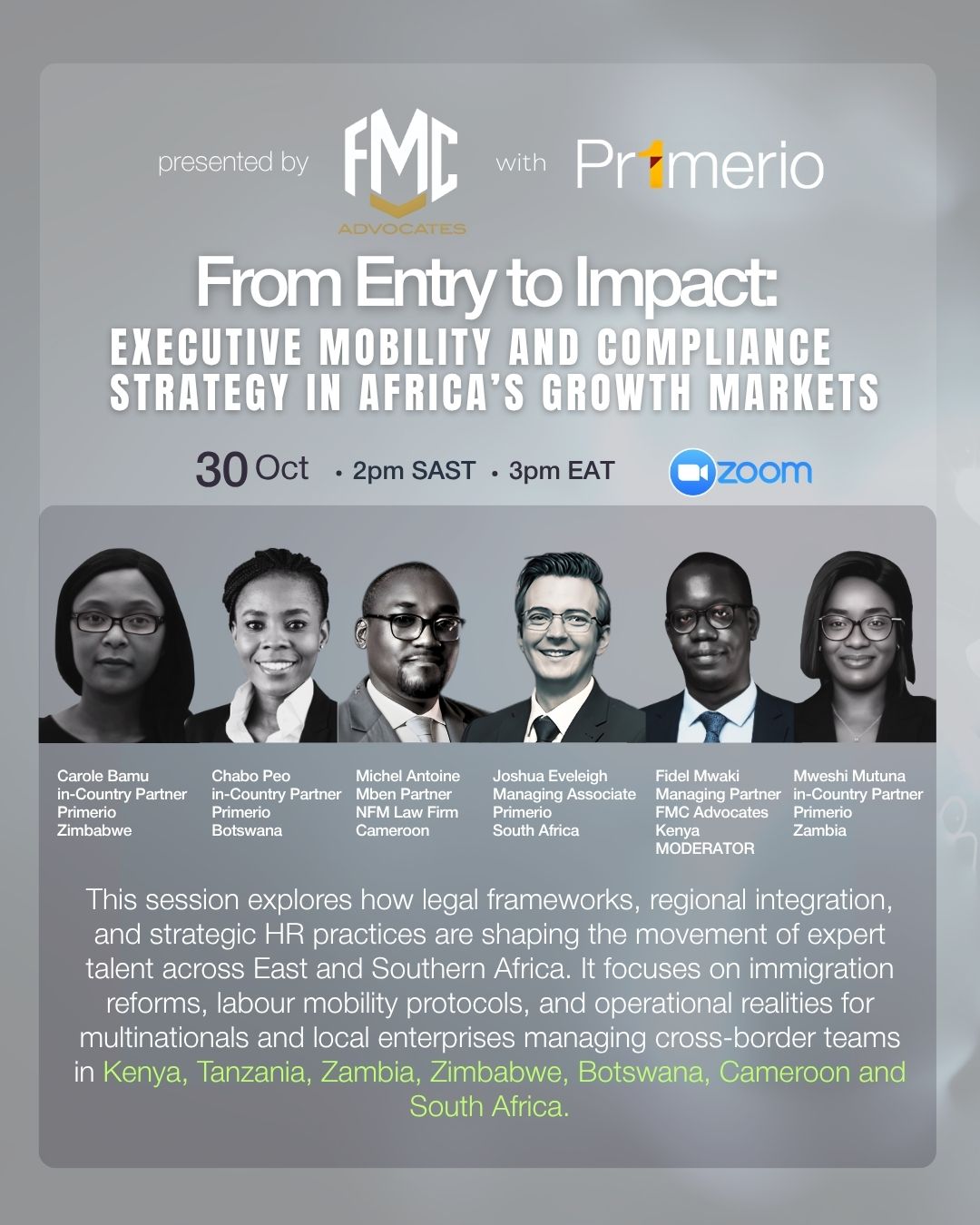 This session explores how legal frameworks, regional integration, and strategic HR practices are shaping the movement of expert talent across East and Southern Africa. It focuses on immigration reforms, labour mobility protocols, and operational realities for multinationals and local enterprises managing cross-border teams in Kenya, Tanzania, Zambia, Zimbabwe, Botswana, Cameroon and South Africa.